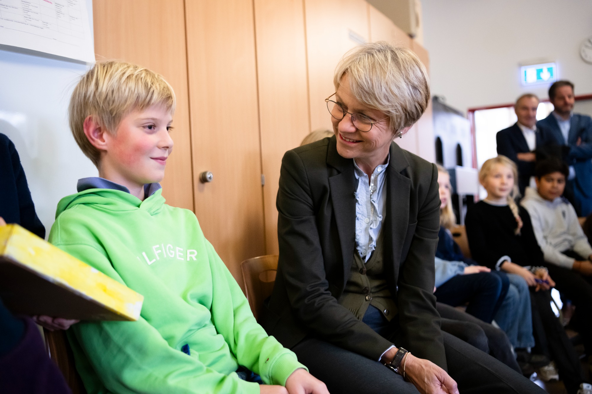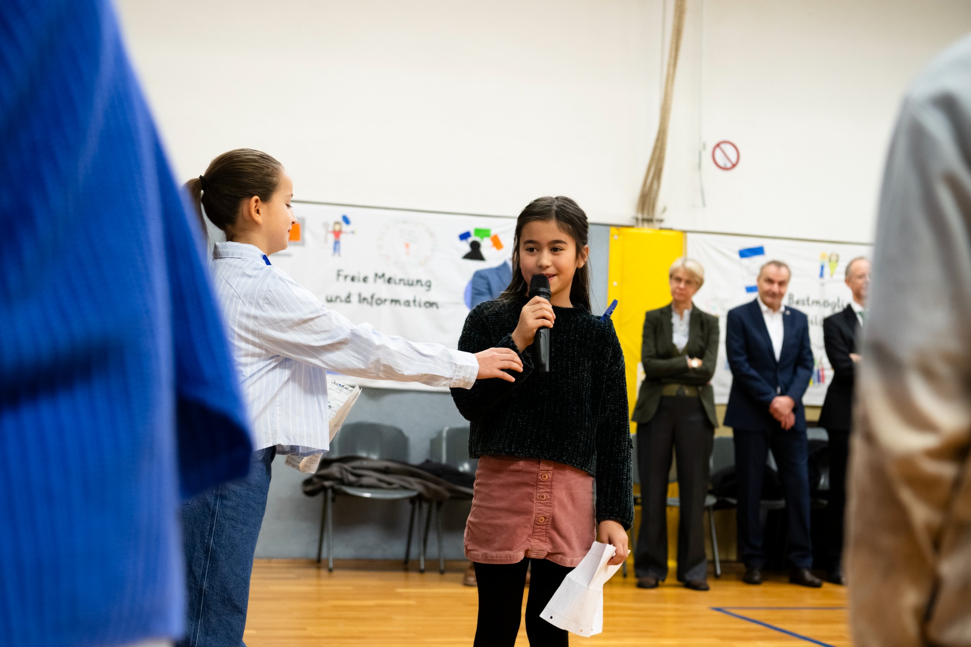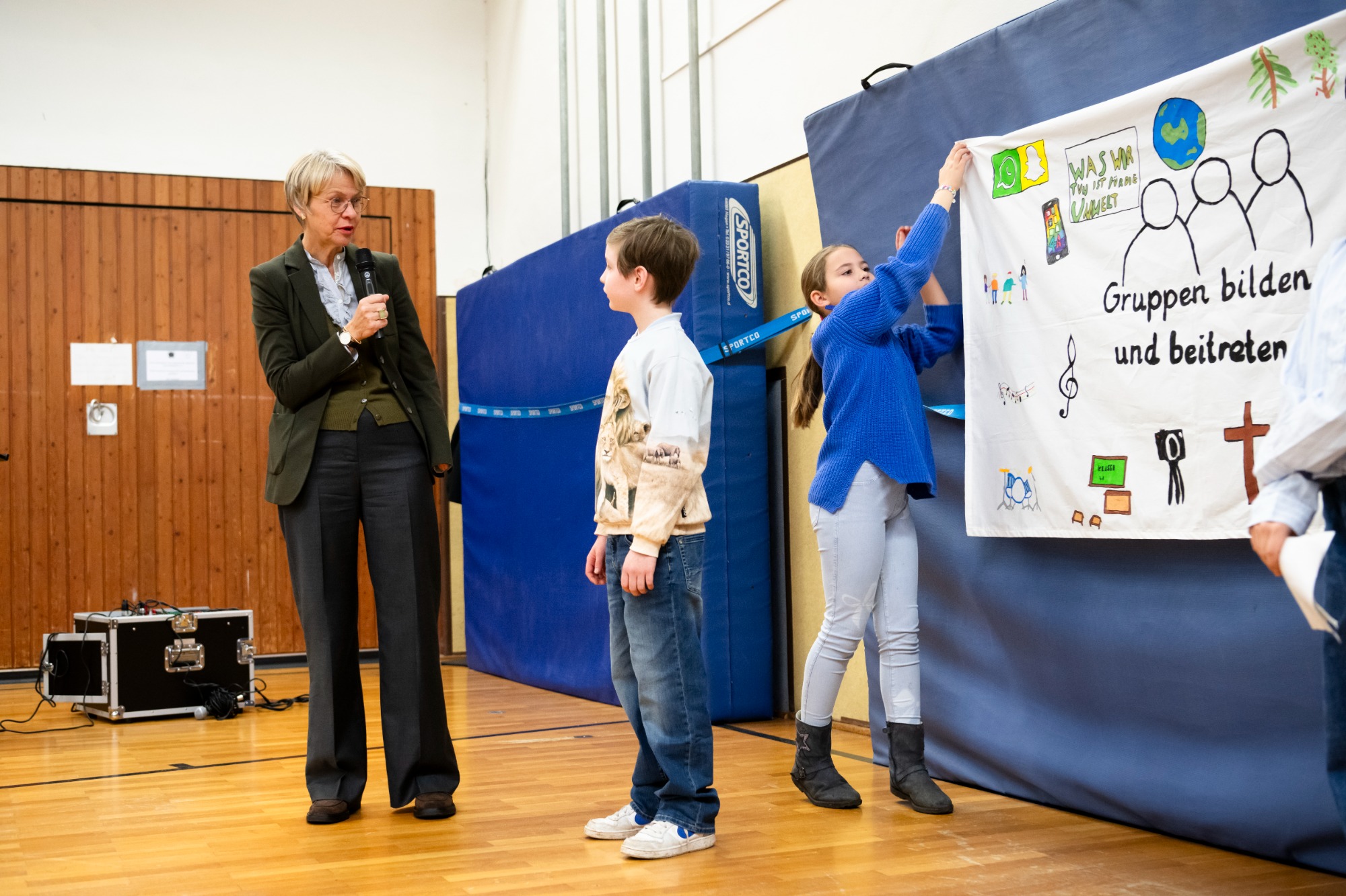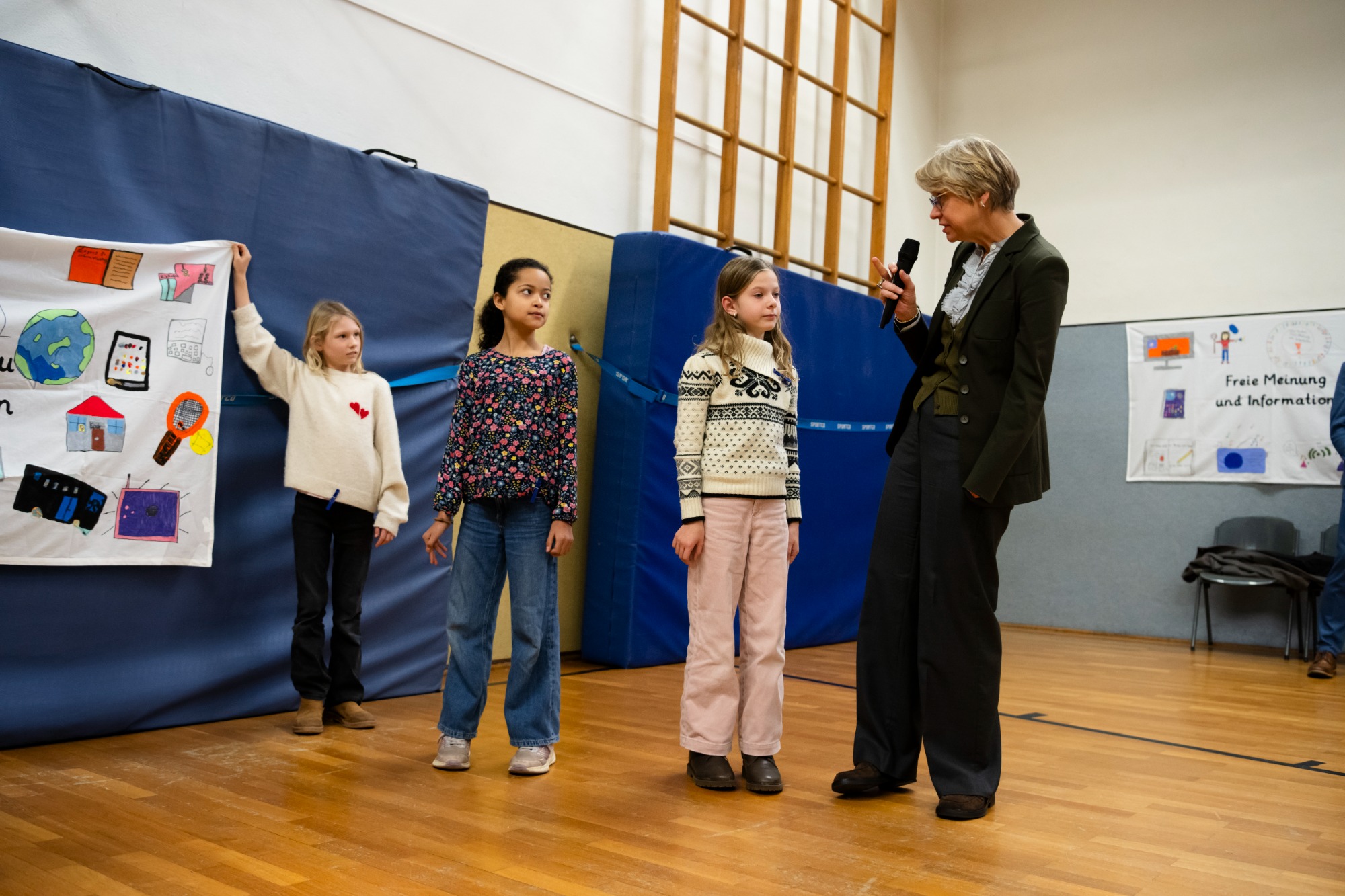 Zwei Klassen stellten ihre Kinderrechte-Poster vor und die Klasse 3a gewährte Einblicke in ihren Klassenrat, bei dem die Schülerinnen und Schüler der Ministerin interessiert Fragen stellen konnten.