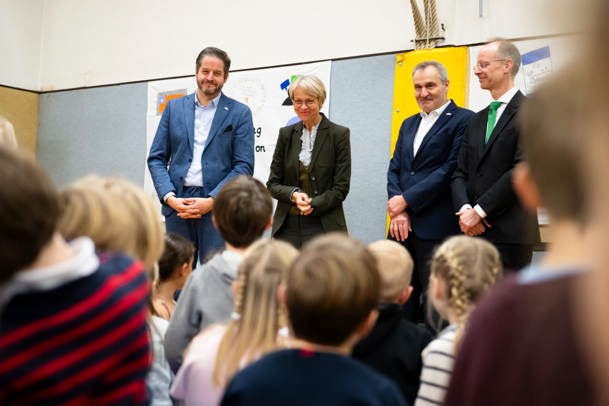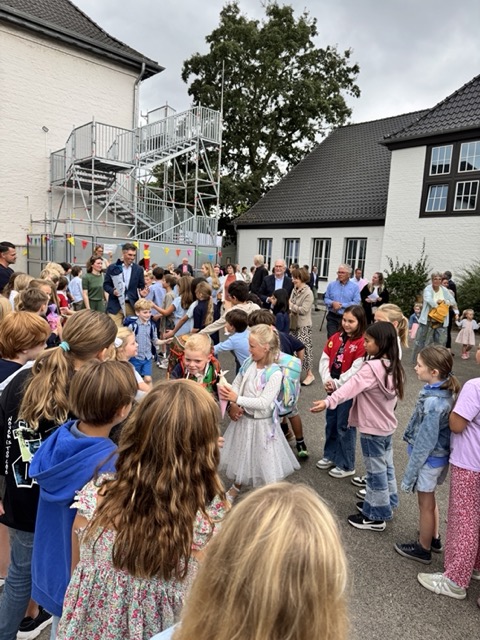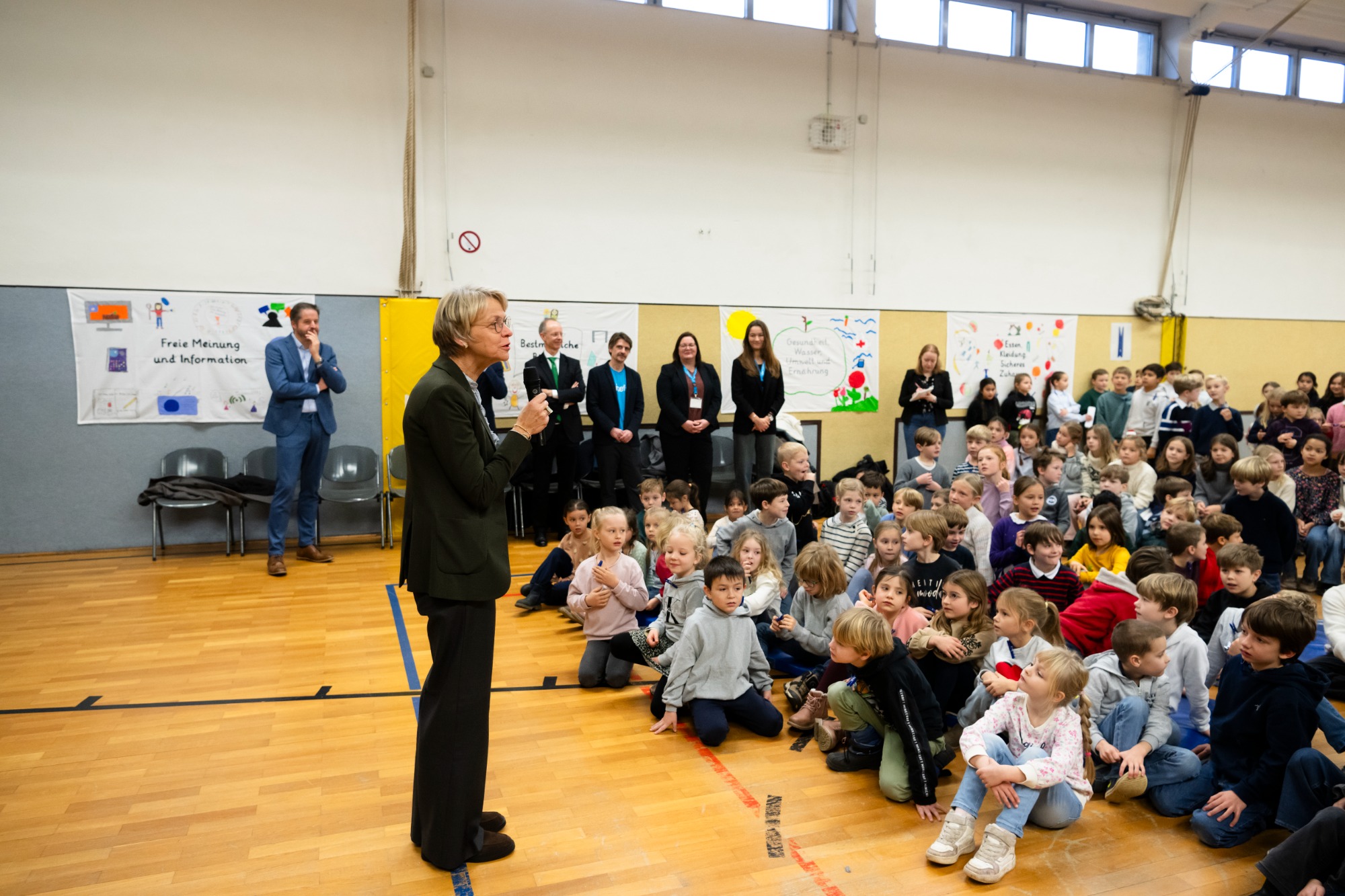 Aus diesem Anlass besuchte Ministerin Dorothee Feller am 4. Dezember 2025 die St.-Mauritius-Grundschule, um sich ein Bild davon zu machen, wie Kinderrechte an unserer Schule gelebt und umgesetzt werden.