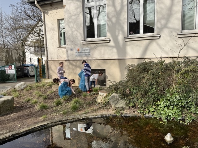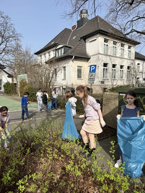 Ausgestattet mit Mülltüten ziehen alle Klassen los, um auf dem Schulgelände und in Büderich fleißig Müll aufzusammeln, ganz nach dem Motto: „Mach‘ weg, was dich stört!"